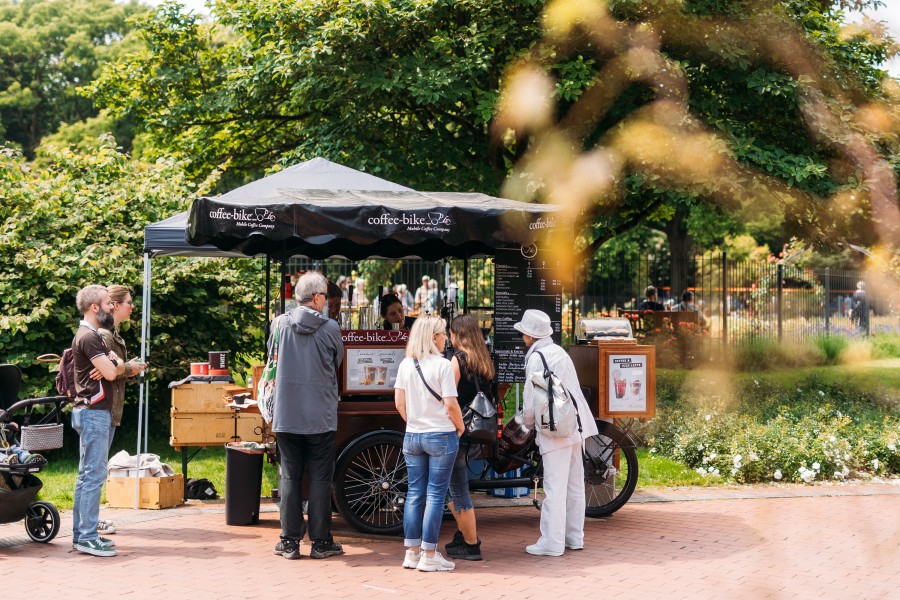 Am Rosengarten hat das Coffeebike seinen festen Standort. Außer bei starkem Regenwetter werden dort Kaffespezialitäten aus aller Welt angeboten.